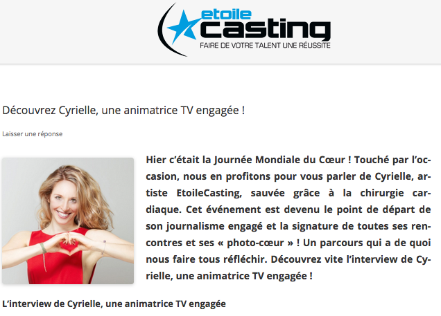 À l'occasion de la Journée Mondiale du cœur le 29 septembre, le site de casting en ligne pour artistes Étoile casting m'a interviewé sur mon parcours dans le Green univers et la symbolique de mes Photo-Cœur..