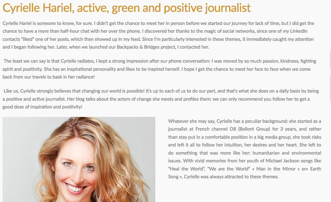 Interviewée par la journaliste engagée et optimiste Marion Gordien - Passionnée de voyages et d'histoires inspirantes Marion est la fondatrice du blogs de voyages www.avossacs.com